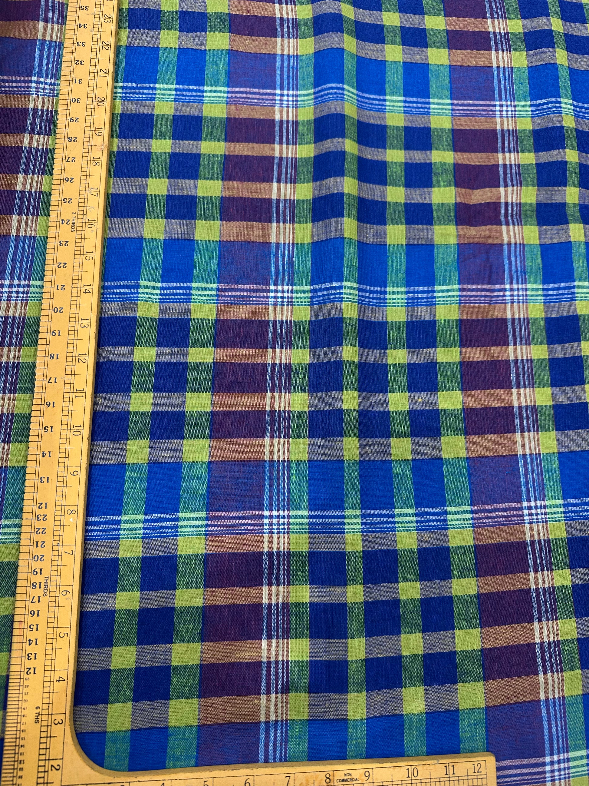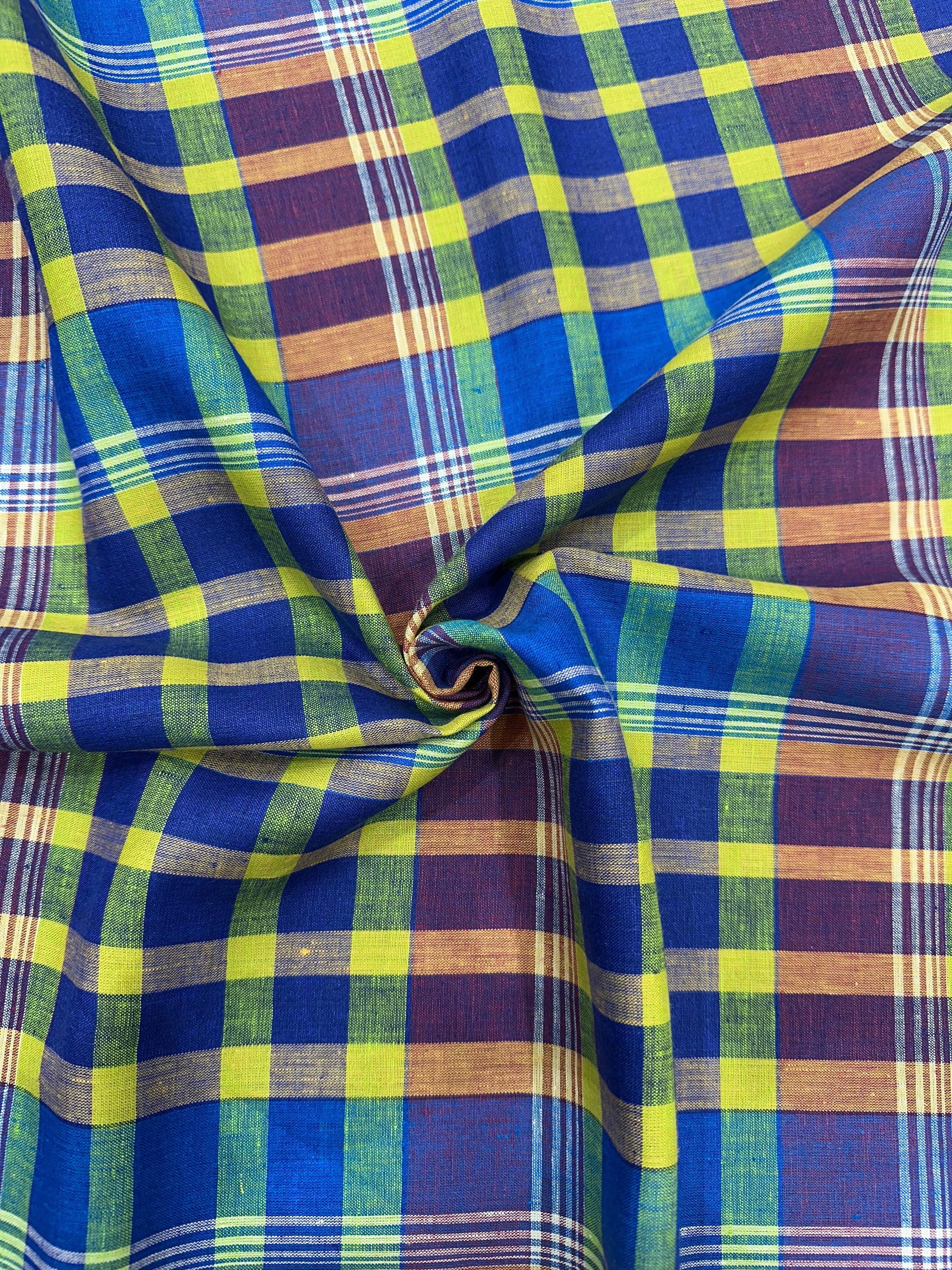 100% शुद्ध लिनन चेक फ़ैब्रिक - बहुरंगी नीला, हरा और भूरा चेक
