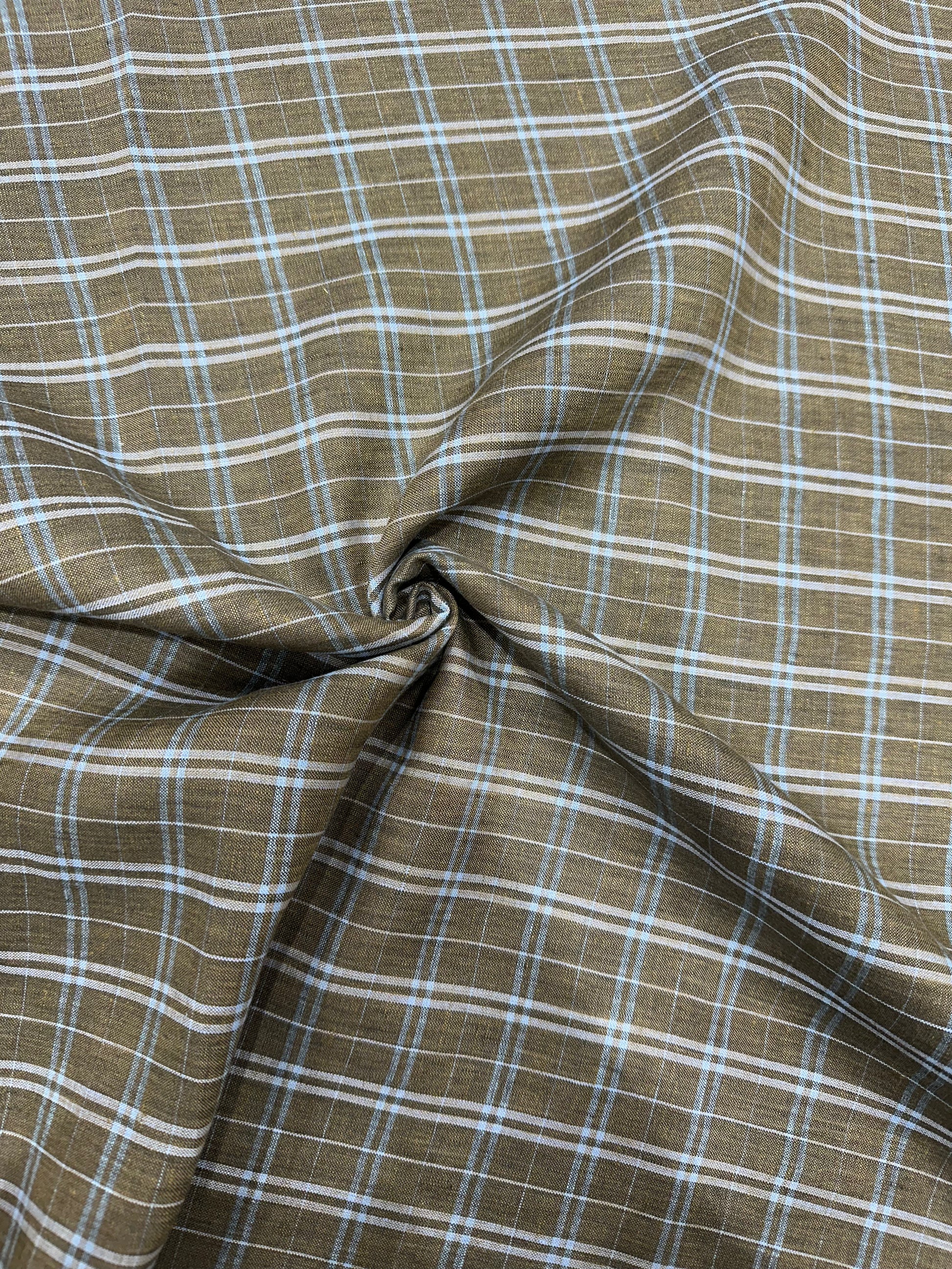 सुंदर जैतूनी भूरे रंग का आधार, महीन आसमानी नीले चेकों के साथ