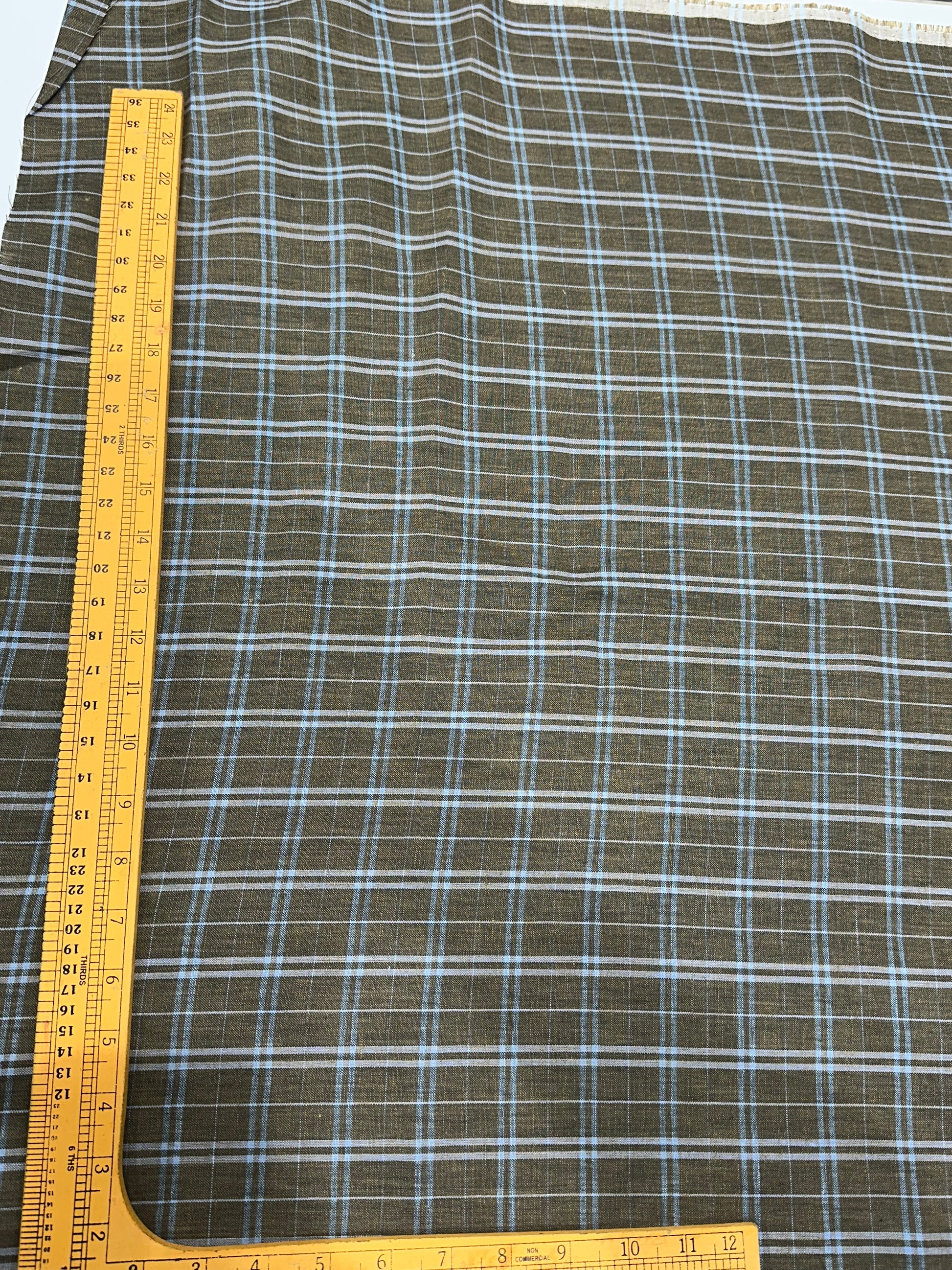100% शुद्ध लिनन चेक फ़ैब्रिक - आसमानी नीले रंग के महीन चेक के साथ जैतूनी भूरा