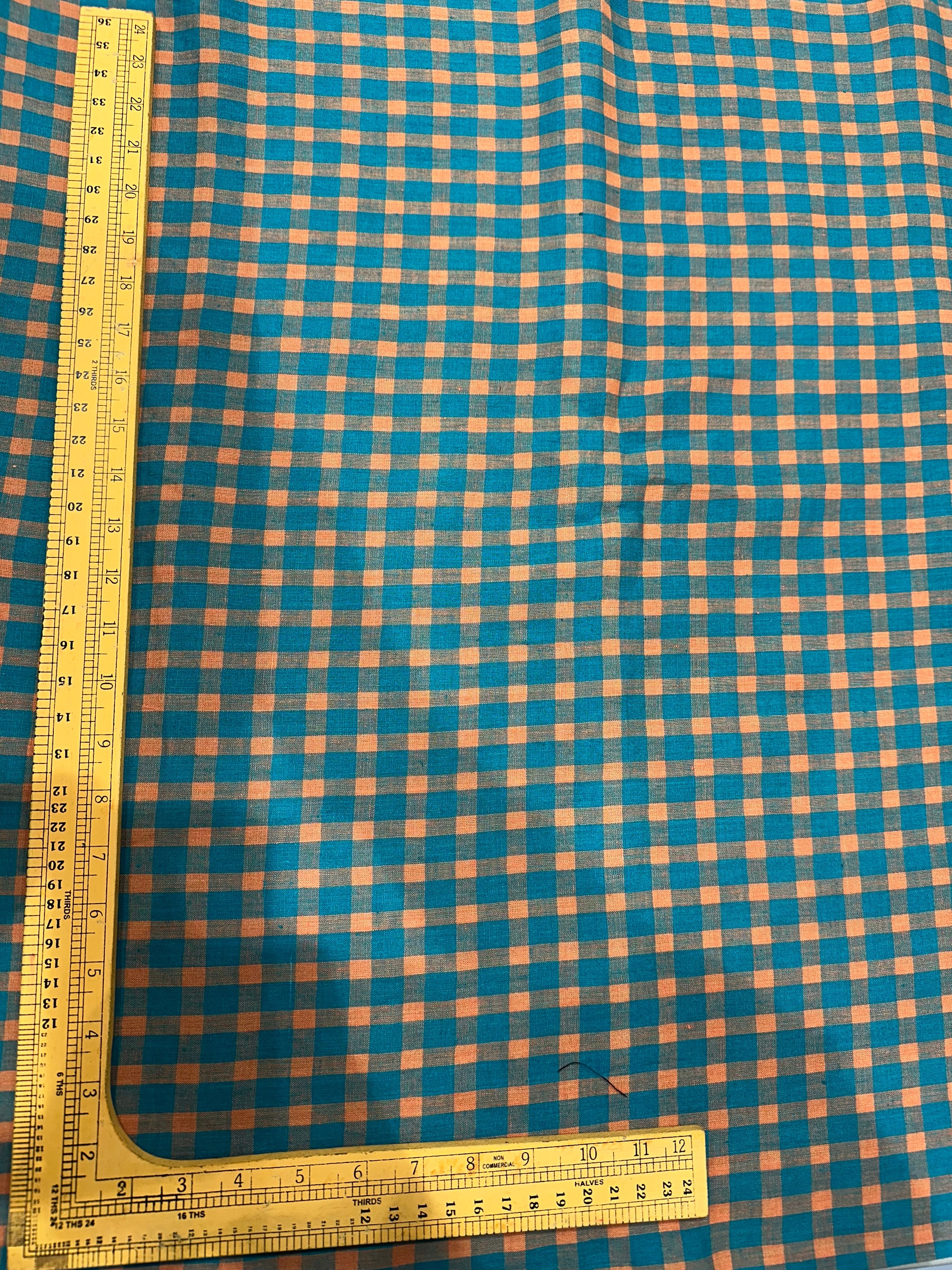 100% शुद्ध लिनन चेक फ़ैब्रिक - फ़िरोज़ा नीला और पीच छोटे चेक