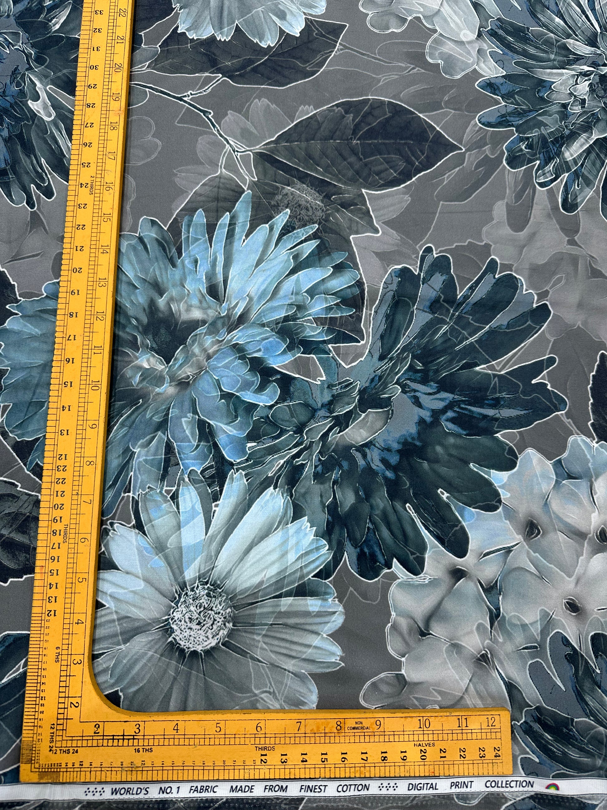 कॉटन डिजिटल प्रिंट फ़ैब्रिक - नीला और ग्रे फ्लोरल डिज़ाइन