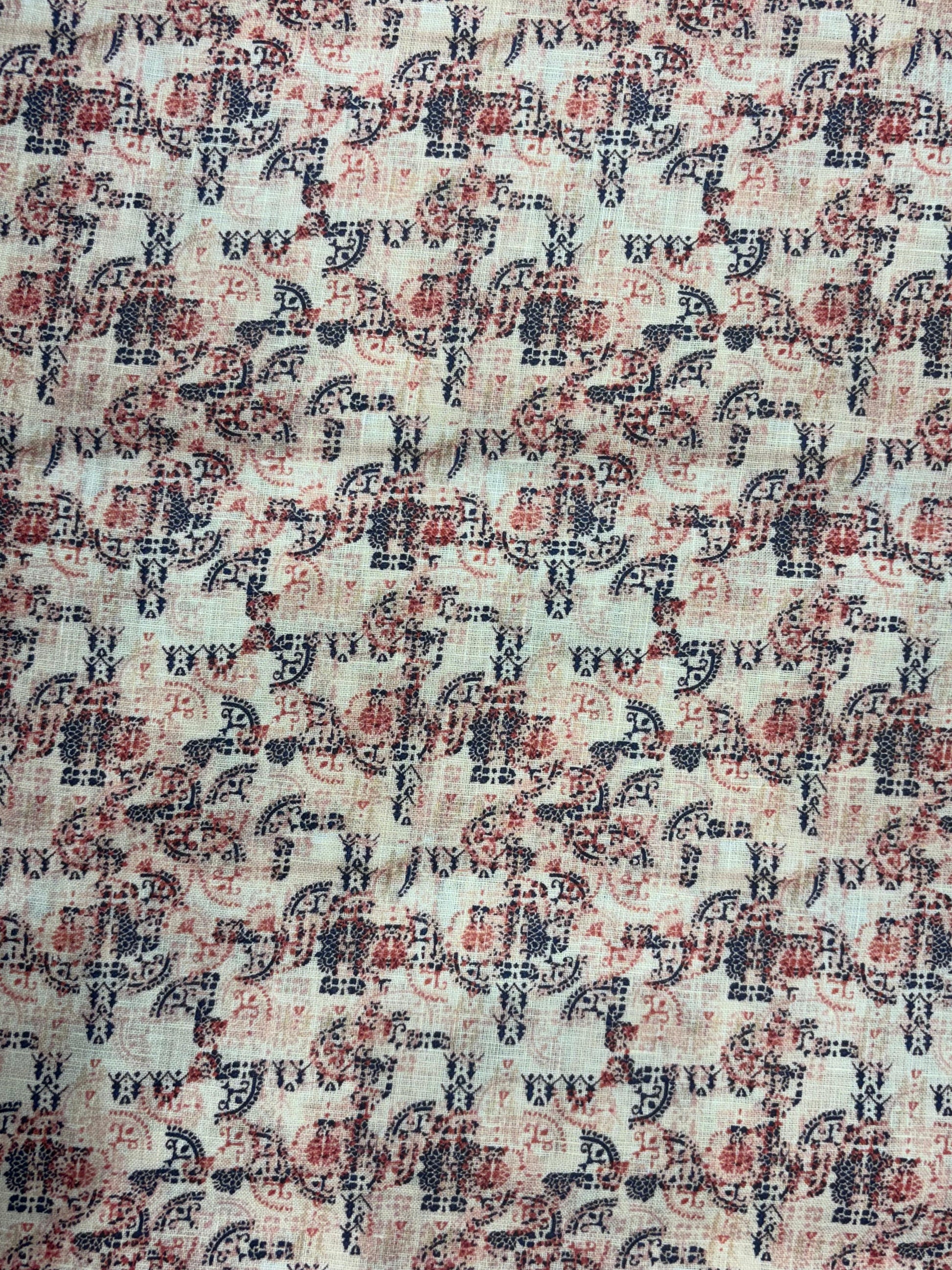 This 100% pure linen fabric features an elegant paisley-inspired multicolor print in shades of beige, rust, and black. Combining the timeless appeal of linen with a stylish printed design, it offers both comfort and sophistication—perfect for creating statement looks.