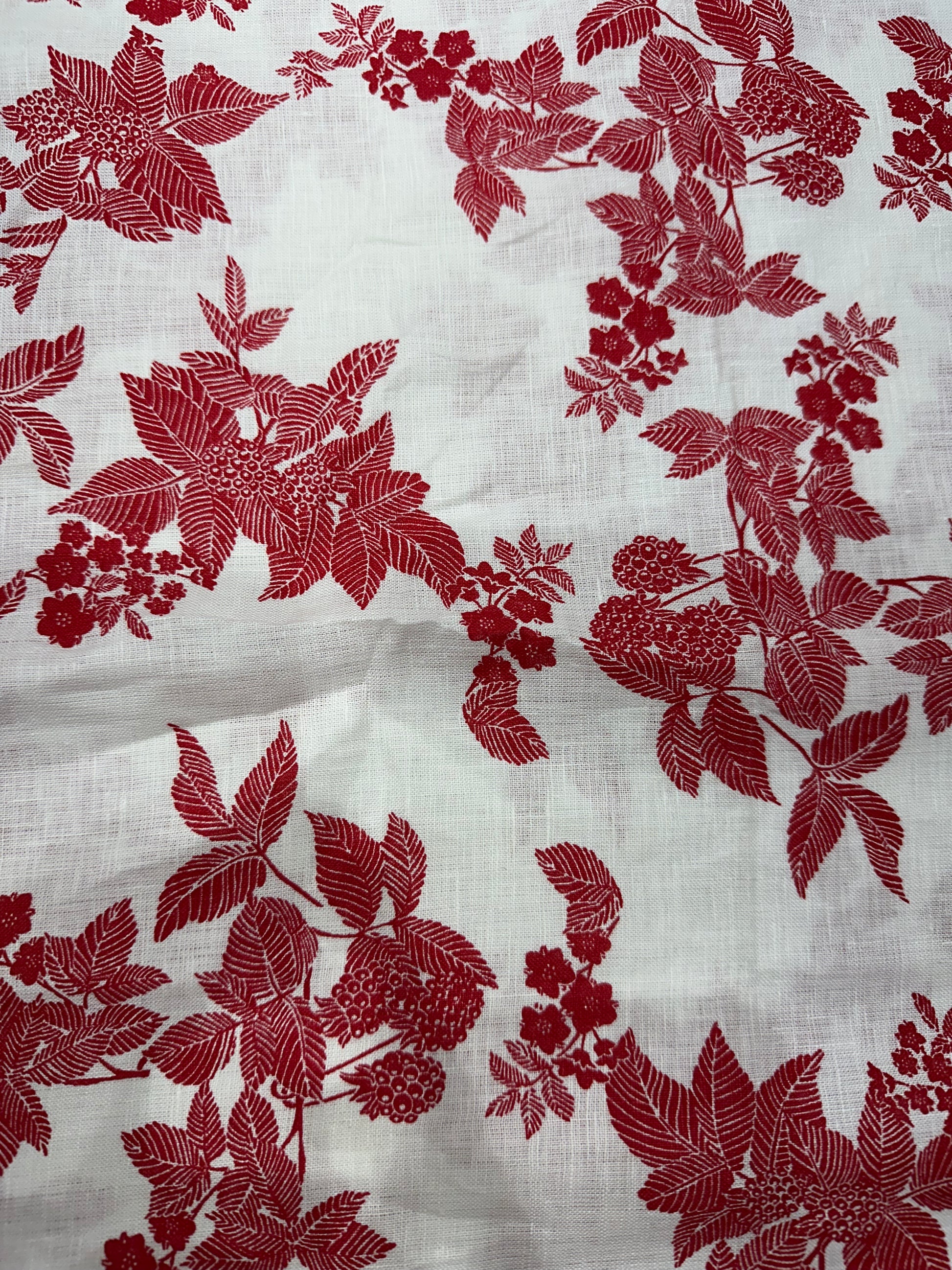 This 100% pure linen printed fabric features a bold red floral pattern on a fresh white base. The natural texture of the linen offers breathability and comfort, while the striking floral print adds a touch of elegance and charm. Perfect for making timeless, stylish pieces.