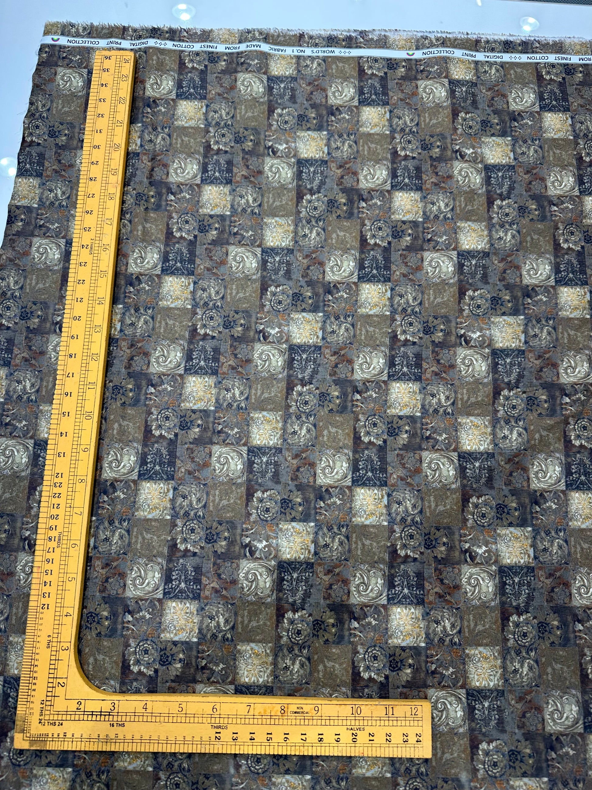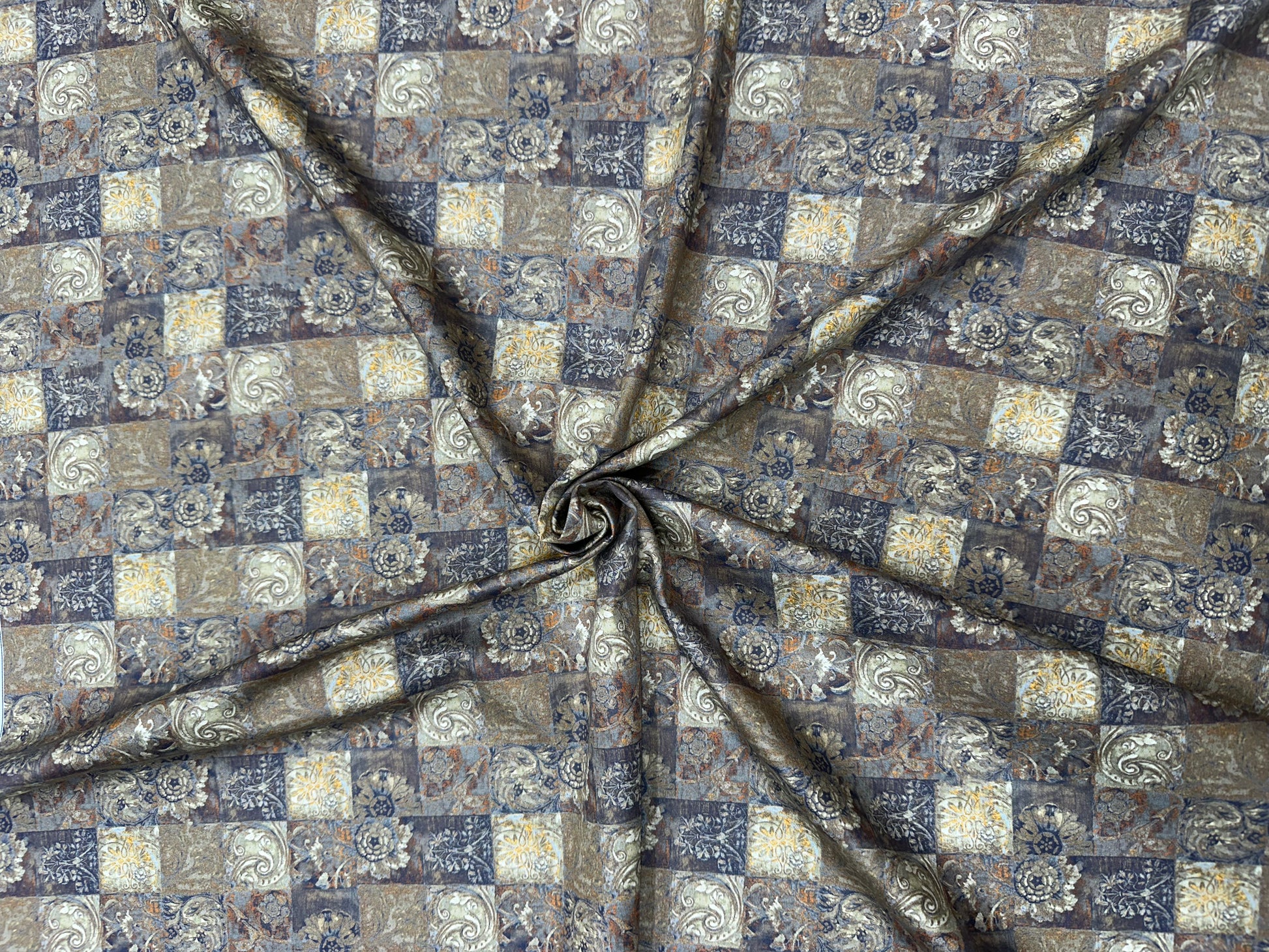 Add a touch of timeless charm to your creations with this Cotton Digital Print Fabric featuring a vintage tile-inspired patch design in elegant tones of beige, grey, and navy. Crafted from 100% pure cotton, it offers unmatched comfort, breathability, and softness—ideal for both casual and festive wear.