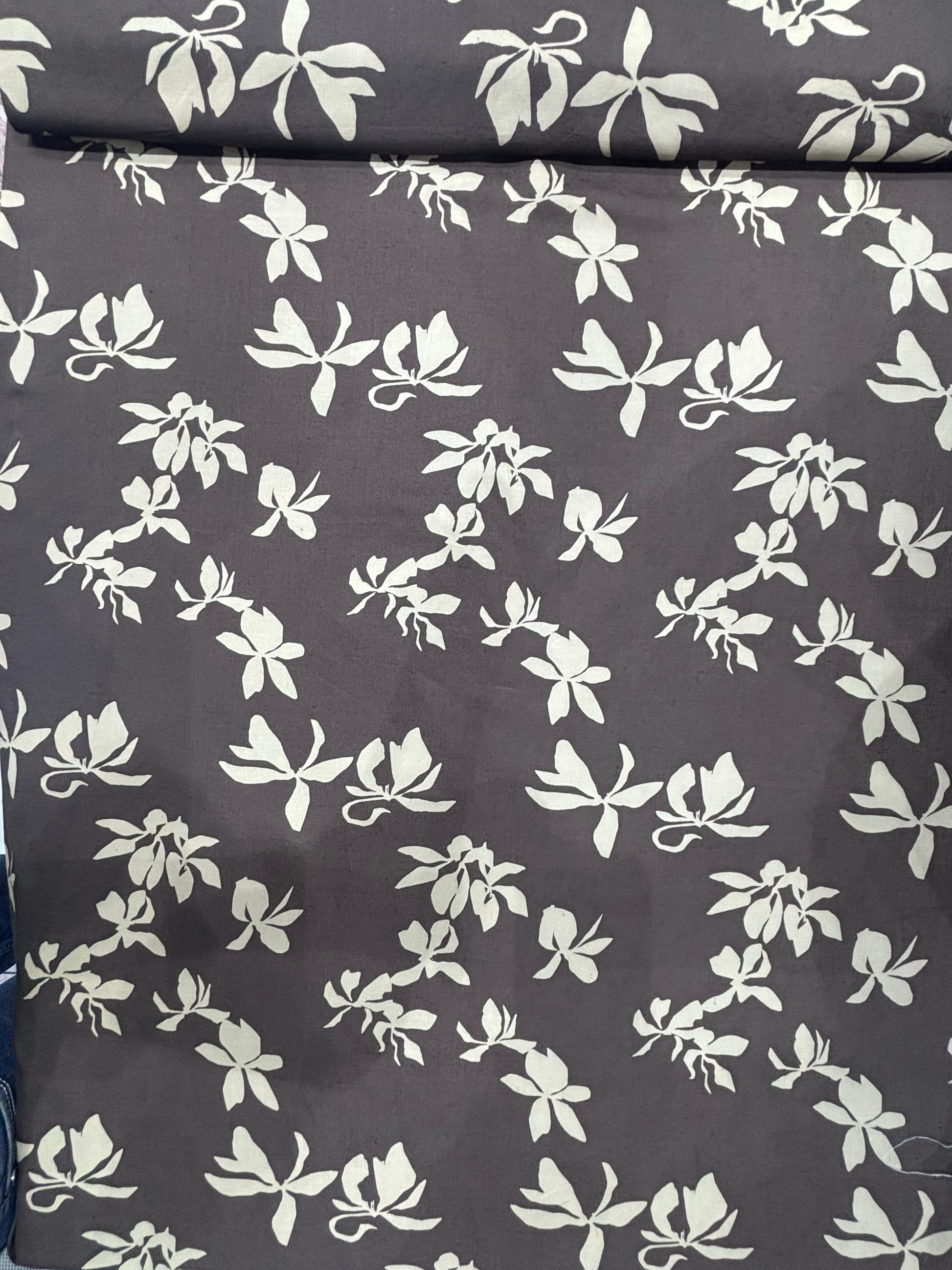 Cotton-Linen Printed Fabric – Charcoal Grey with White Floral Motifs (45% Cotton, 55% Linen)